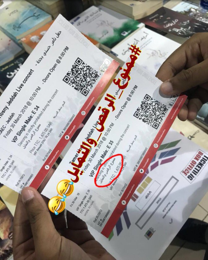 تداول نشطاء في مواقع التواصل الاجتماعي صورا أكدوا أنها لبطاقات حفل المغني المصري #تامر_حسني في #السعودية ، والتي طبع عليها قائمة شروط على الجمهور الذي سيحضر الالتزام بها.