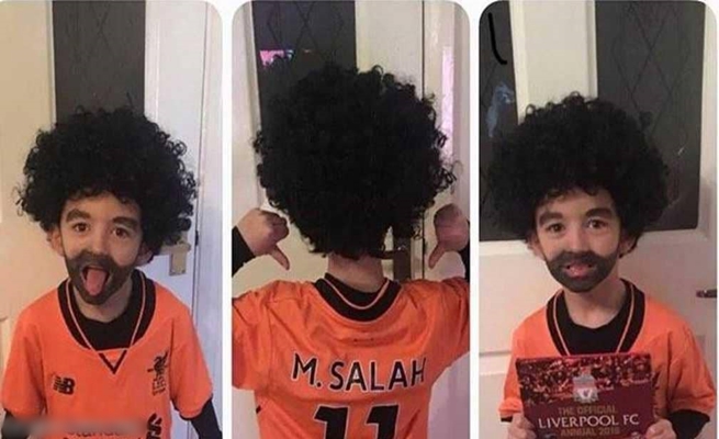 فقد تداول عدد من رواد مواقع التواصل الاجتماعي صورا لطفل بريطاني، لا يزيد عمره عن 5 أعوام، يرتدي شعرا مستعارا ورسم على وجهه لحية ليتشبه بمحمد صلاح.
