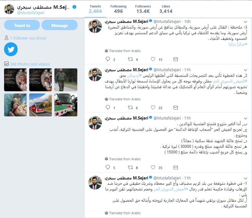 وأضاف سيجري، الذي يعتبر المصدر الوحيد لهذه المعلومات: “هذه الخطوة تأتي بعد التصريحات المنصفة التي أطلقها الرئيس #أردوغان بحق #الجيش_السوري_الحر معلن وقوفه بوجه كل من يحاول الإساءة لسمعة ثوارنا الأبطال بهدف تشويه صورتهم أمام الرأي العام أو التشكيك في عدالة قضيتنا واحقيتنا في الدفاع عن أرضنا وشعبنا”.