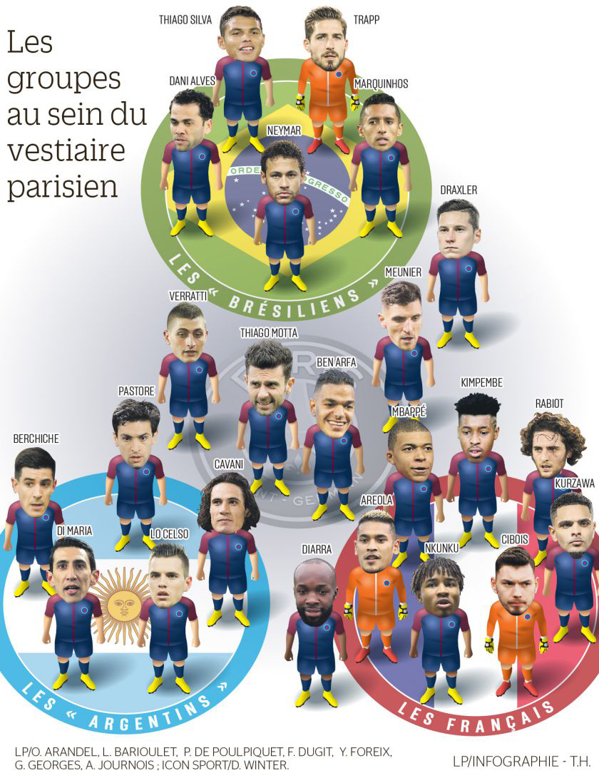 ووفقًا للصحيفة، فإن العناصر الفنية لباريس سان جيرمان منقسمة على نفسها إلى ثلاثة تكتلات يضاف إليهم تكتل مستقل ، حيث يضم كل تكتل مجموعة من اللاعبين يسعون لفرض نفوذهم على الفريق حتى و ان كان على حساب مصلحة النادي.