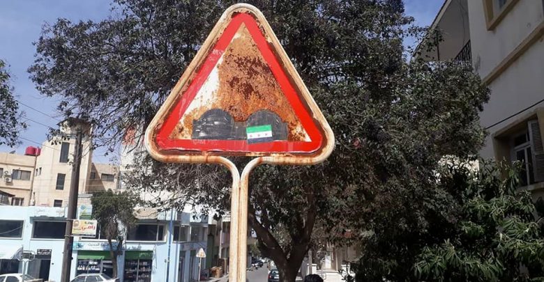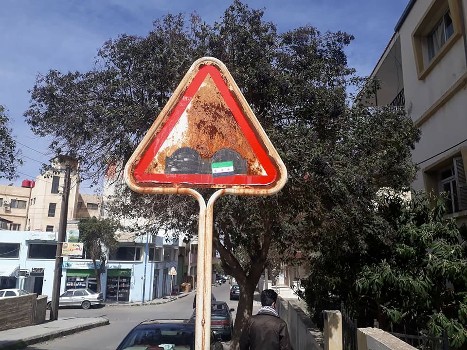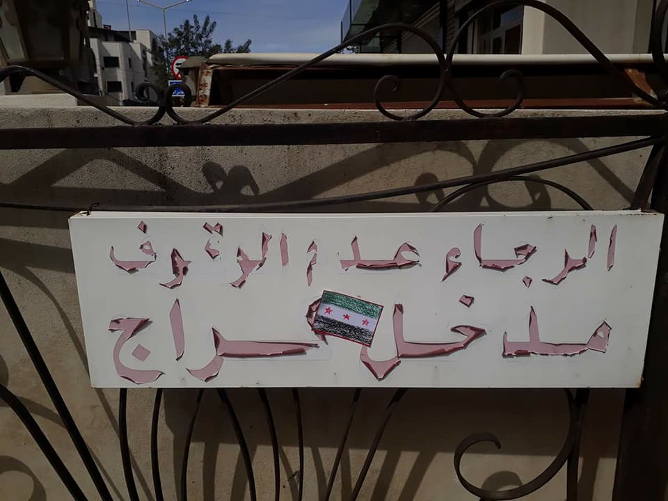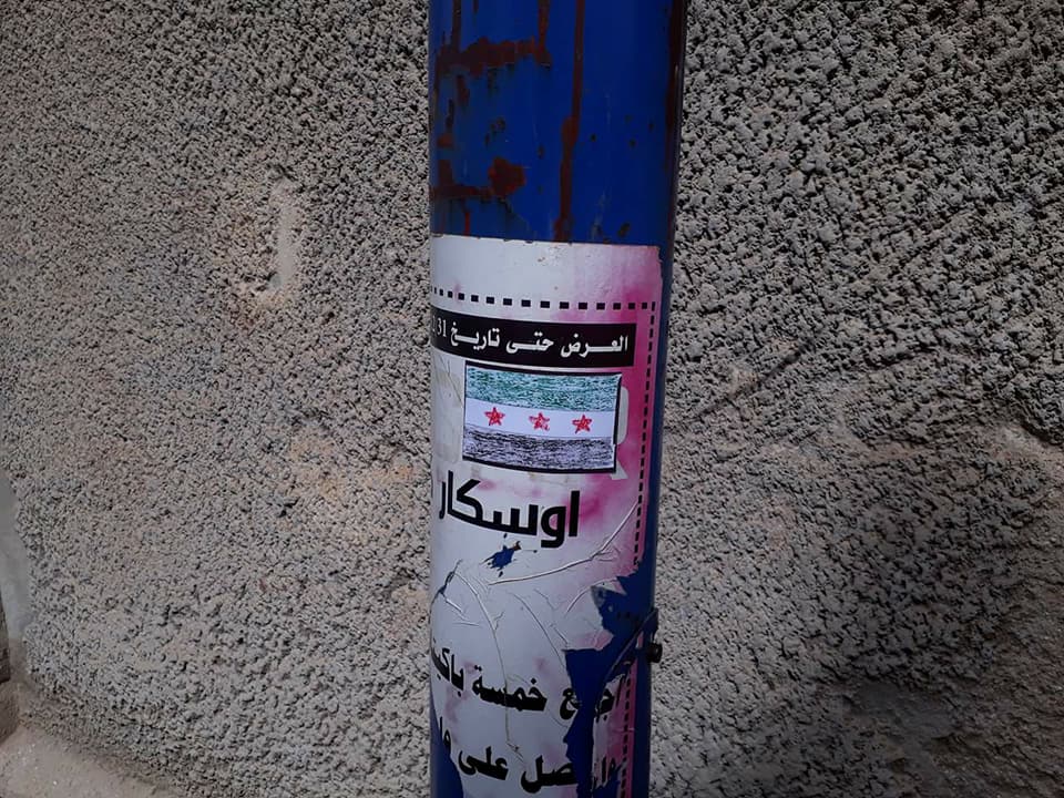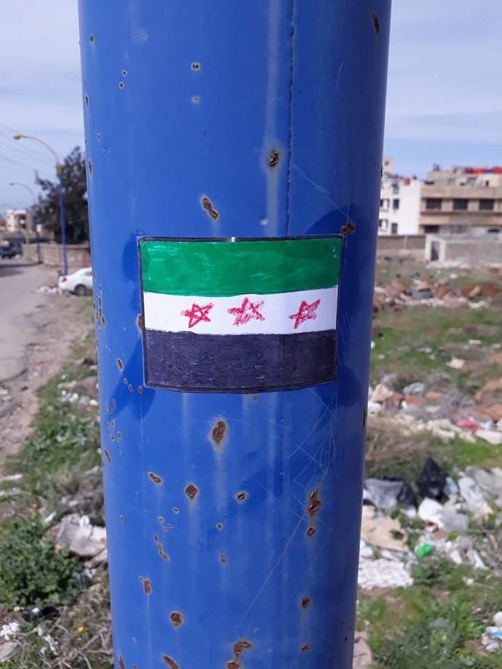 وتم وضع هذه الملصقات بالتزامن مع الذكرى السابعة لاندلاع الثورة السورية.