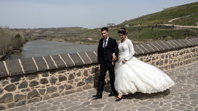 عروسان يحتفلان بزفافهما على جسر في منطقة ديار بكر توافقا مع عيد نوروز