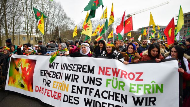 في هانوفر بالمانيا أكراد يتظاهرون ضد التدخل العسكري التركي في عفرين السورية بمناسبة عيد نوروز