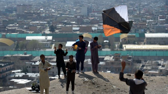 في العاصمة الأفغانية شبان يحتفلون بمقدم عيد نوروز على مرتفع يطل على المدينة