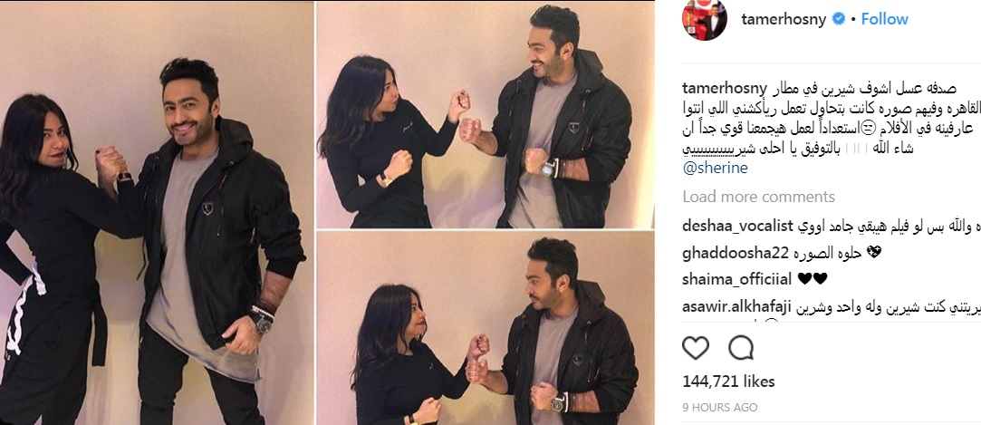 وعلق على الصور قائلاً: “صدفة عسل اشوف شيرين في مطار القاهرة وفيهم صورة كانت بتحاول تعمل “ريأكشني” اللي انتوا عارفينه في الأفلام استعدادًا لعمل هيجمعنا قوي جدًا إن شاء الله، بالتوفيق يا أحلى شيرين”.