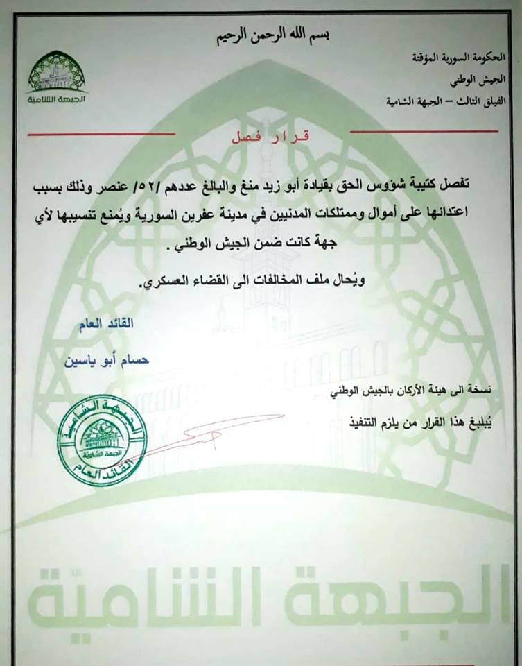 في هذا السياق، أصدر القائد العام للجبهة الشامية، حسام أبو ياسين، قراراً بفصل كتيبة شؤون الحق، بقيادة أبو زيد منغ، والبالغ عددها 52 عنصراً، وذلك “بسبب اعتدائها على أموال وممتلكات المدنيين، في مدينة عفرين”.