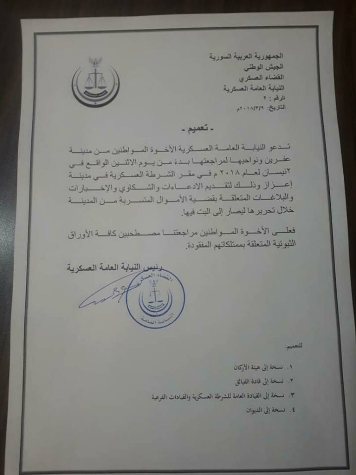 دعت “النيابة العامة العسكرية”، التابعة لفصائل الجيش الحر المشاركة بعملية غصن الزيتون التي تقودها تركيا، أبناء مدينة عفرين ونواحيها، ممن تعرضوا للسرقة، لمراجعتها بدءاً من يوم الإثنين (2/4)، في مقر الشرطة العسكرية، في مدينة اعزاز.