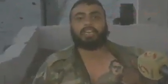 وكشف أبو حلب عن صدره ليظهر وشماً لصورة بشار الأسد، وعلق عليه بالقول: “ولك أنا هادا دمي .. حيطوا علم لكل بلاد العرب ولكل بلاد الأجانب .. هادا عنصر من الجيش العربي السوري .. صرلي 8 سنين عسكري”.