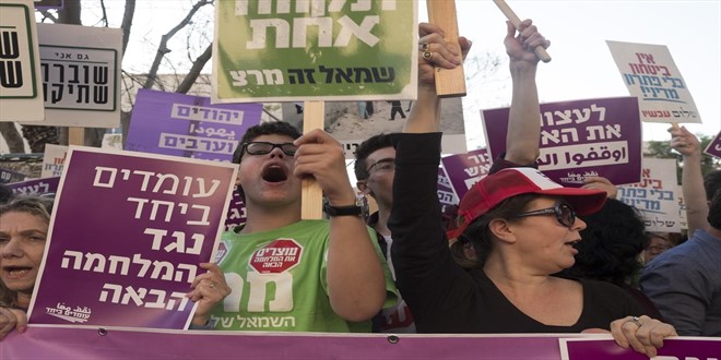 تظاهر المئات من الإسرائيليين اليساريين، مساء الأحد، في مدينة تل أبيب (شمال)، رفضا للتصعيد العسكري الإسرائيلي على حدود قطاع غزة.