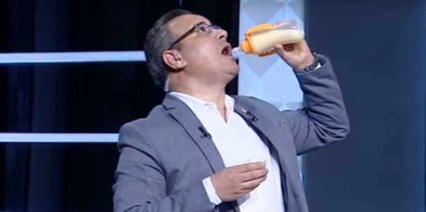 إعلامي مصري يشرب حليب الأطفال بـ ” الببرونة ” على الهواء ( فيديو )