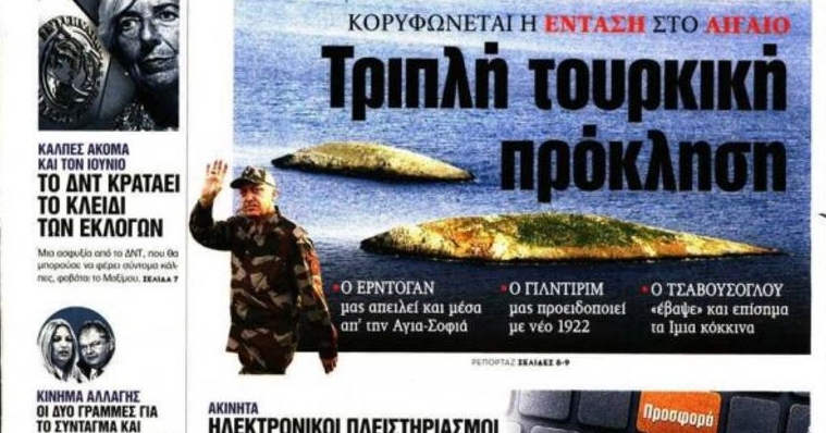 وكان من أبرز تعليقات الصحف اليونانية، مقالاً نشرته جريدة “Ta Nea” اليونانية بعنوان “تركيا تستفز اليونان من ثلاثة اتجاهات”، مستخدمة صورة مموهة لأردوغان بالزي العسكري، مؤكدة أن تلاوة الأخير القرآن الكريم داخل متحف آيا صوفيا والتصريحات التركية بخصوص جزر كارداك المتنازع عليها، وكذلك تصريحات رئيس الوزراء بن علي يلدريم التي قال فيها: “من يريدون حماية حياة القرصنة في بحر إيجه، عليهم أن يتذكرو أحداث عام 1922″، جميعها أفعال استفزازية.