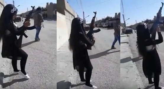 وتبدو على ملامح الفتاة التي لم تعرف جنسيتها أنها ما زالت طفلة، إلا أنه بالرغم من ذلك تجيد استخدام السلاح وإطلاق النار باحترافية كبيرة.