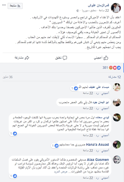 وقال الكاتب “قمر الزمان علوش” (70 عاماً)، في منشور له على صفحته في فيسبوك، قبيل الضربة الأمريكية البريطانية الفرنسية: “اعتقد بأن اﻻعتداء اﻻميركي تراجع وانحسر وستودع التهديدات في اﻻرشيف .. أعرف كم تشعرون بالغضب واﻻهانة من اولئك السوريين المثيرين للقرف الذين طالبوا اﻻميركيين بقصفنا وحددوا بنك الأهداف”.