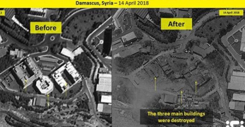 أظهرت صور التقطت بواسطة الأقمار الصناعية، حجم الدمار الذي حل بمركز جمرايا السوري للأبحاث العلمية، والذي تم استهدافه خلال الهجوم الأميركي البريطاني الفرنسي المشترك، السبت.