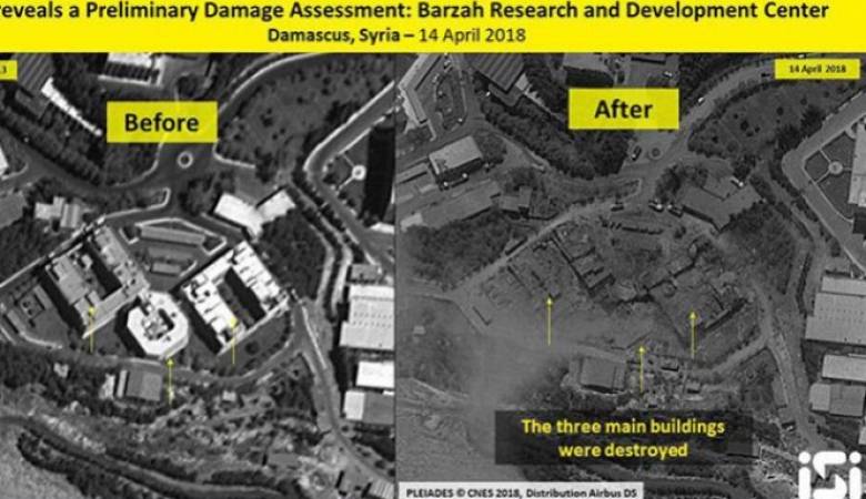 وبحسب ما تظهره صور الأقمار الصناعية، دمرت الهجمة الغربية المشتركة، بشكل شبه كامل، ثلاثة مبان مركزية تابعة لمركز الأبحاث العلمية الذي يقع شمال غربي دمشق، خلف جبل قاسيون، ويعتقد بأنه تجرى فيه أهم الأبحاث الكيميائية، كما يتم تطوير وتخزين الأسلحة هناك.