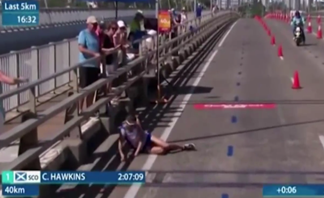 وأظهر الفيديو العداء الاسكتلندي كالوم هوكينز (25 عاما) حين كان متقدما عن بقية المنافسين في ماراثون ألعاب دورة الكومنولث المقامة بمدينة غولد كوست الأسترالية.