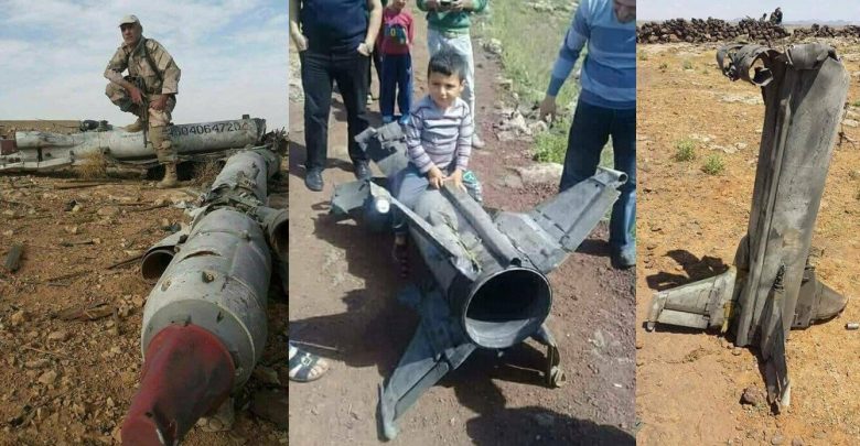 بقايا مضادات بشار الأسد الجوية تسقط فوق رؤوس المدنيين .. و عناصره يتباهون بحطامها على أنها ” صواريخ أمريكية ” ! ( صور )
