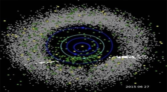 وتظهر الصور كوكب الأرض ممثلاً بنقطة زرقاء تحيط بها المئات من النقاط الخضراء التي تمثل الكويكبات والمذنبات التي تمر بالقرب من الأرض، وتعرف باسم (NEOs).