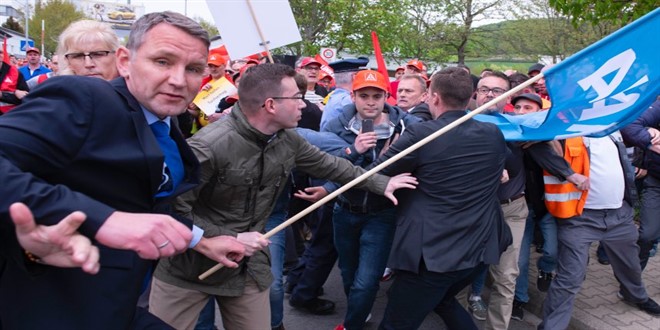 تعرض يورغن هوكه، السياسي المتطرف في حزب البديل اليميني، الثلاثاء، للطرد من مظاهرة للعاملين في فرع شركة “أوبل”، في مدينة آيزاناخ، في ولاية تورينغن اﻷلمانية.