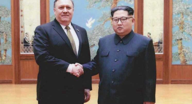 ويظهر في الصورتين، كيم جونغ أون وهو يسلم على مايك بومبيو، خلال الزيارة التي قام بها المسؤول الأمريكي لكوريا الشمالية خلال أبريل/ نيسان الجاري.