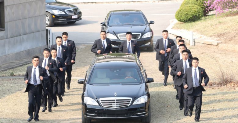وظهر جيش من الحراس يحيطون بسيارة كيم خلال تحركها، في مشهد غريب.