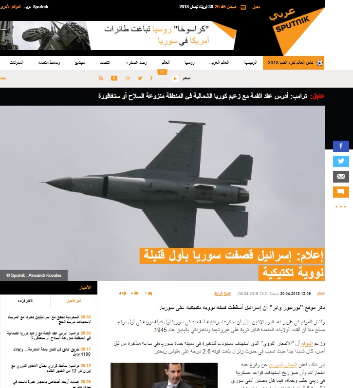قالت وكالة “سبوتنيك” الروسية، الاثنين، في خبر لها بعنوان “إسرائيل قصفت سوريا بأول قنبلة نووية تكتيكية”، إن طائرة إسرائيلية أسقطت في سوريا أول قنبلة نووية في أول نزاع مسلح منذ أن ألقت الولايات المتحدة قنابل ذرية على هيروشيما وناغازاكي باليابان عام 1945.