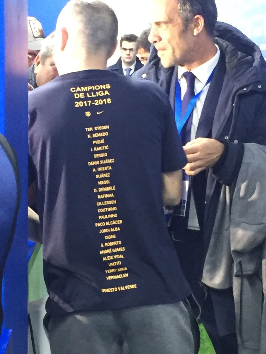 وارتدى لاعبو برشلونة خلال التتويج، قميصاً حمل أسماء كافة اللاعبين الذين شاركوا في الموسم الجاري وساهموا بالتتويج، باستثناء الثلاثي الذي رحل في الانتقالات الشتوية الماضية، المتمثل بالأرجنتيني خافيير ماسكيرانو، والتركي أردا توران، والإسباني جيرارد ديلوفيو، وهو ما اعتبرته الصحافة الإسبانية وجماهير النادي “خطأ جسيماً”.