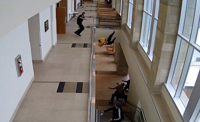 أمريكي يهرب من قاعة المحكمة بالقفز من الطابق الثاني ! ( فيديو )