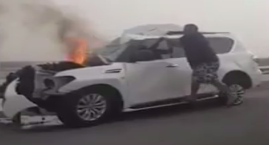 شرطي إماراتي ينقذ مواطناً حاصرته النيران داخل سيارته ( فيديو )