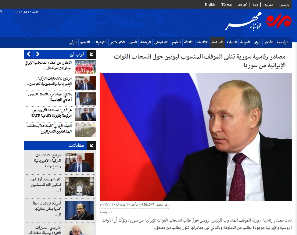 قالت قناة “الميادين”، التابعة للنظام، نقلاً عن ما أسمتها “مصادر رئاسية” أنّ الموقف المنسوب إلى الرئيس الروسيّ فلاديمير بوتين، بشأن طلب انسحاب القوات الإيرانية من سوريا، “غير صحيح”.