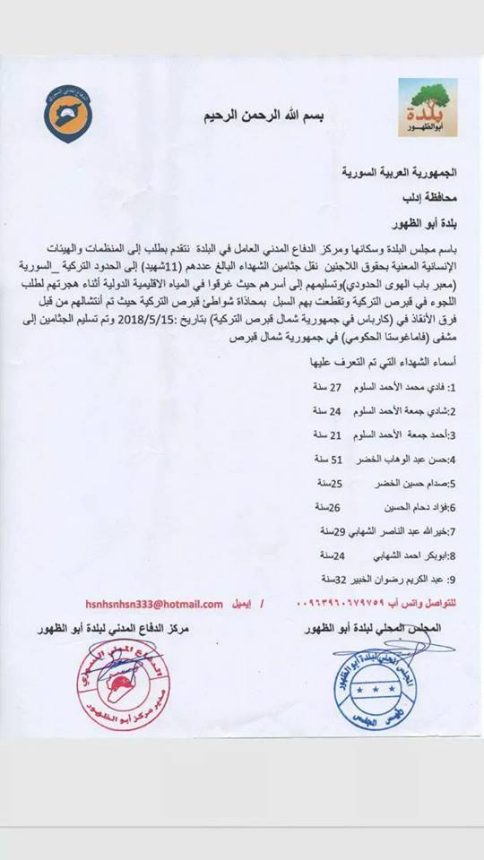 طالب المجلس المحلي، وسكان بلدة أبو الظهور، بريف إدلب الشرقي، المنظمات والهيئات الإنسانية، بالعمل على استرداد جثث سوريين غرقوا في المياه الإقليمية، أثناء توجههم إلى اليونان.