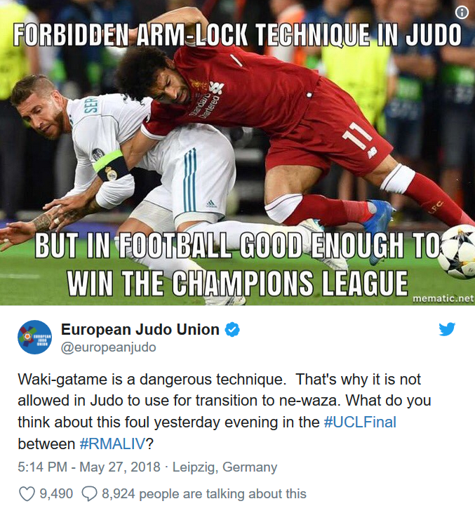 وفي تغريدة على الصفحة الرسمية للاتحاد القاري للجودو في موقع تويتر، قال الاتحاد، إن “ما قام به سيرخيو راموس مع محمد صلاح حركة ممنوعة في لعبة الجودو، لكن في كرة القدم فإنها كافية لتتوج بدوري أبطال أوروبا”.