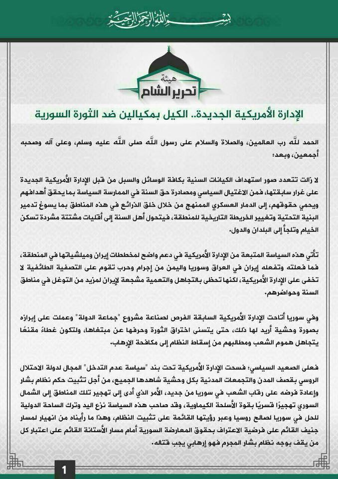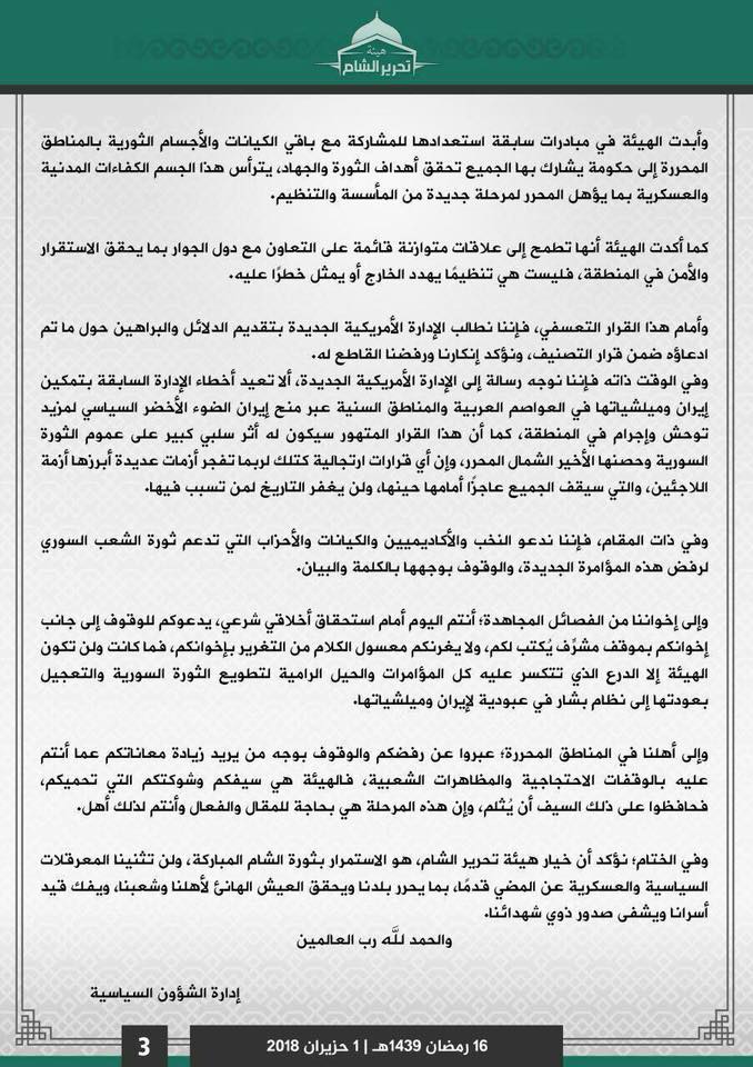 ونشرت هيئة تحرير الشام بياناً مطولاً ردت فيه على القرار، ومما جاء فيه أن “الهيئة عبرت وصرحت في أكثر من مناسبة أنها كيان مستقل لا يتبع لأي تنظيم أو حزب لا القاعدة ولا غيرها”.