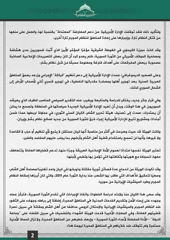 وأضافت أن تغيير التسمية جرى في يناير/كانون الثاني 2017، بهدف تعزيز المنظمة موقعها في الانتفاضة السورية، وتحقيق أهداف خاصة أخرى في إطار علاقتها بـ”القاعدة”، متابعةً: “منذ يناير 2017، واصلت الجبهة العمل من خلال الهيئة في السعي لتحقيق تلك الأهداف”.