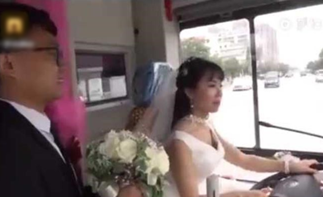 قادت عروس صينية بفستانها الأبيض حافلةً مزينة بالصور والبالونات وتبدو مرتاحةً وبكامل أناقتها فيما عريسها يحمل باقة الورود ويجلس في المقعد بجانب عروسه السائقة في الطريق إلى حفل زفافه.