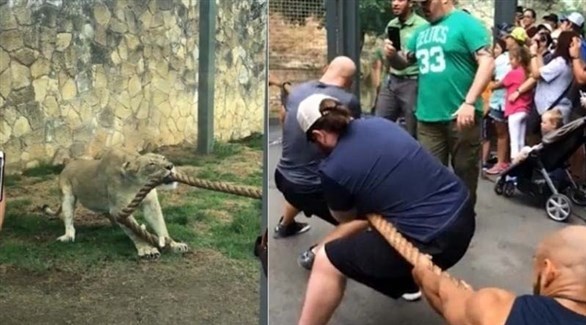 في أمريكا .. مسابقة لشد الحبل بين أسد و 3 مصارعين ( فيديو )