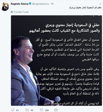 وأضاف: “صحيح أنّ حفلي الغنائي الأخير في السعودية أصبح في أقل من 24 ساعة (الشغل الشاغل) للناس، ولكن الأصح أنّ الفرحة التي لمستها لدى المنظّمين والحاضرين كانت عارمة، وأكبر من أن توصف بكلمات أو أن توضع خارج سياقها الطبيعي”.