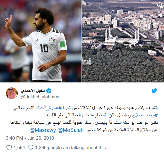 أهدى الإعلامي السعودي دخيل الأحمدي اللاعبَ #محمد_صلاح ، لاعب منتخب مصر ونادي #ليفربول الإنكليزي، 10 نخلات من تمر المدينة المنورة؛ بسبب امتناع اللاعب عن تسلُّم الجائزة المقدَّمة من إحدى شركات الخمور تقديراً لأدائه في الملعب بكأس العالم روسيا 2018.