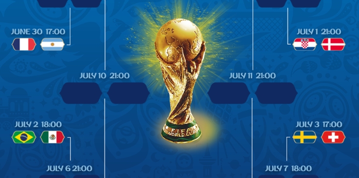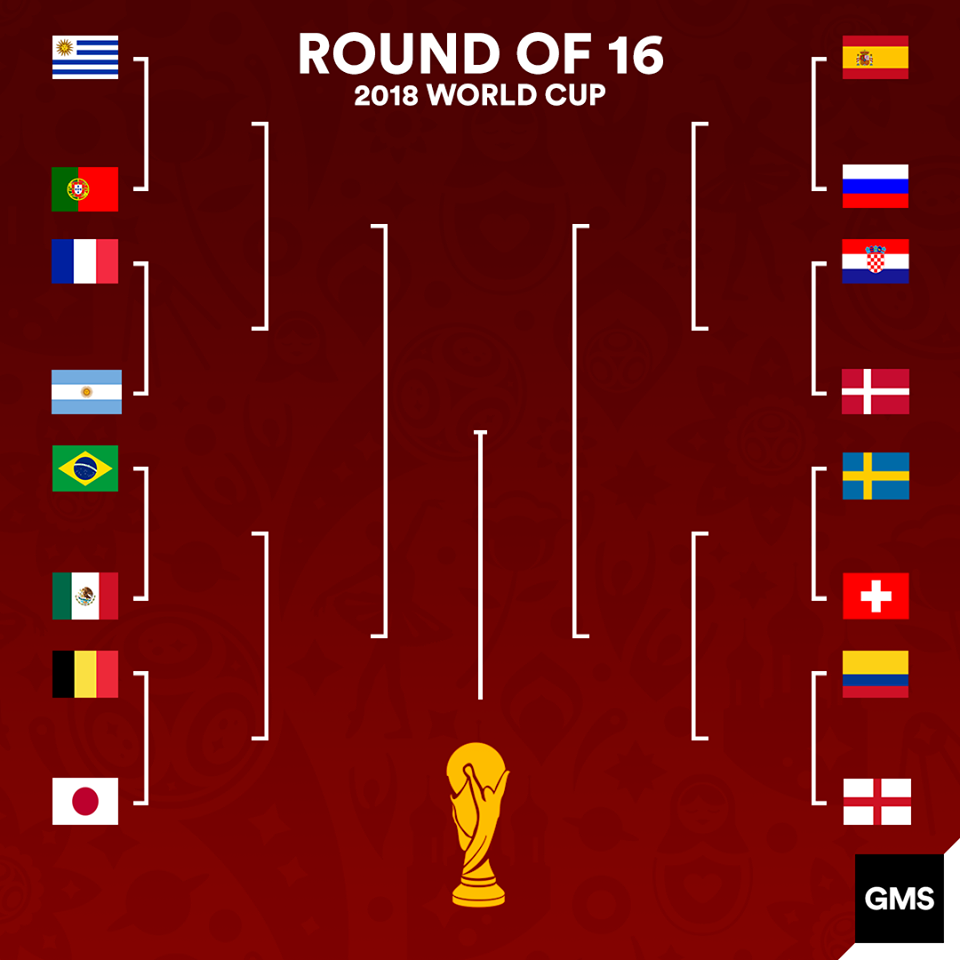 وفي الدور ثمن النهائي، تلتقي السبت فرنسا مع الأرجنتين، والأورغواي مع البرتغال، والأحد إسبانيا مع روسيا وكرواتيا مع الدنمارك، والاثنين البرازيل مع المكسيك وبلجيكا مع اليابان، والثلاثاء السويد مع سويسرا وإنكلترا مع كولومبيا.