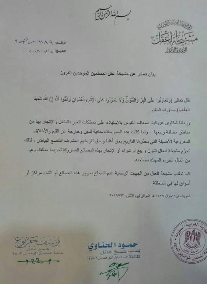 في السياق، أصدرت مشيخة عقل المسلمين الموحدين الدروز، بياناً حرم تناول وبيع أو شراء أو الاتجار بالبضائع المسروقة تحريماً مطلقاً، معتبرين إياه من المال الحرام المهلك لصاحبه، وطالب البيان من الجهات الرسمية عدم السماح بمرور تلك البضائع أو إنشاء مراكز أو أسواق لها في المنطقة.