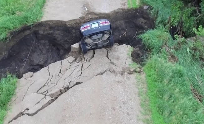 نشرت وكالة “أسوشيتيد برس” شريط فيديو من مدينة “ريد وود فولس” في ولاية مينيسوتا الأمريكية يظهر حفرة عملاقة تبتلع سيارة وسط طريق ريفي هناك.