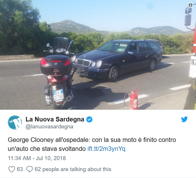 أفادت أنباء بأن نجم #هوليوود ، #جورج_كلوني ، أصيب في حادث اصطدام سيارة بدراجته في مدينة سردينيا الإيطالية.