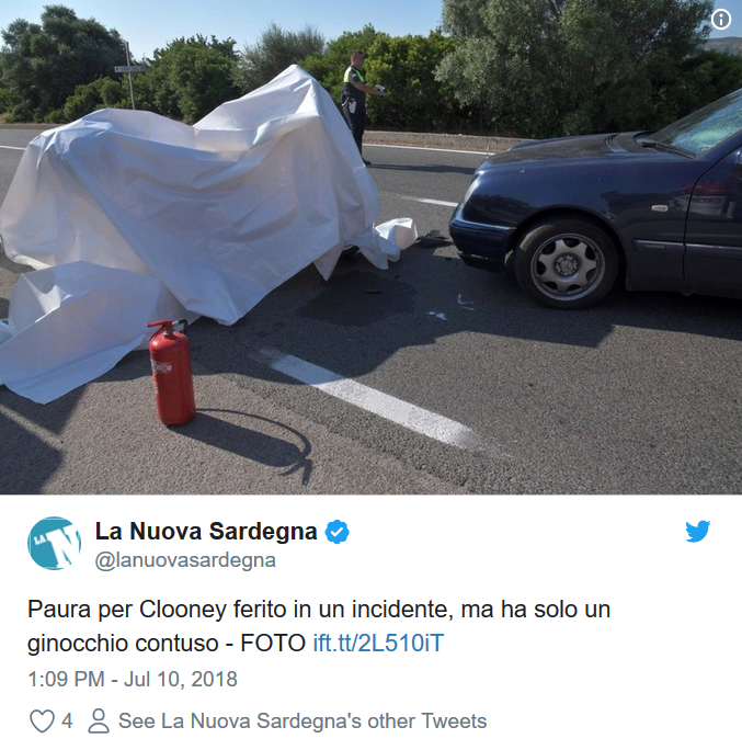 ويتواجد كلوني في مدينة سردينيا لتصوير وإنتاج وإخراج مسلسل تلفزيوني قصير بعنوان “Catch 22″، وتظهر الصور الأولية للحادث تحطم زجاج السيارة، مع وجود طفاية حريق على الطريق، من دون أن يظهر أي شخص من طرفي الحادث.