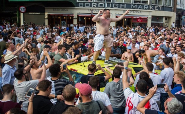 وتداولت عشرات الحسابات على شبكات التواصل الاجتماعي صوراً لسيارة إسعاف صغيرة تم تعطيلها ومن ثم تحطيمها، وصعد عشرات المشجعين يرقصون فوقها فور انتهاء مباراة إنكلترا والسويد الهامة التي انتهت مساء السبت بفوز المنتخب الإنكليزي بهدفين مقابل لا شيء.