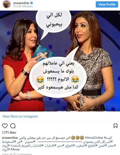 نشرت المغنية اليمنية أروى صورة لها في حسابها عبر “انستغرام” تسخر فيها من الفنانة #إليسا حيث تظهر في الصورة الاخيرة وهي تحمل ألبومها الجديد وتقول: “لكل اللي بيحبوني” فيما ظهرت أروى تتساءل :”يعني اللي عاملالهم بلوك ما يسمعوش الألبوم؟ كدا مش هيسمعوه كثير”.