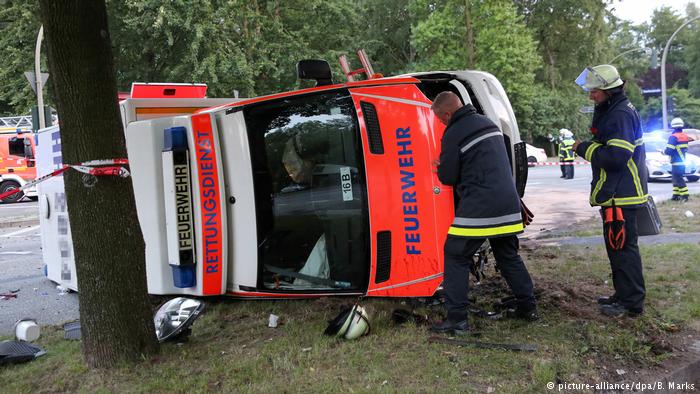اصطدمت سيارة إسعاف كانت بداخلها امرأة على وشك الولادة بسيارة أخرى عند تقاطع أحد الطرق في مدينة هامبورغ الألمانية، ما أدى إلى انقلابها على أحد جانبيها.