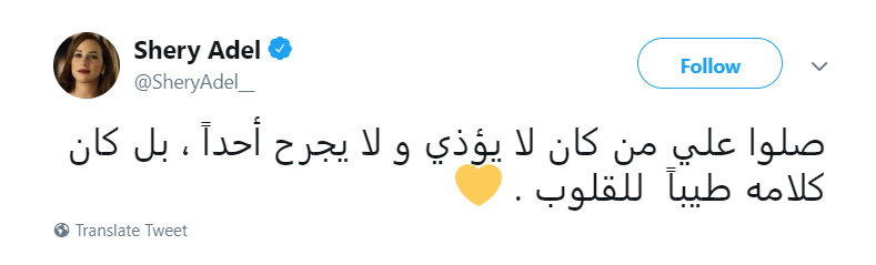 وفي الوقت الذي ينتظر فيه الجميع أن تتحدث شيري عن كواليس زواجها المفاجئ من معز مسعود، بعد تعاونهما مؤخرا من خلال مسلسل “السهام المارقة”، اختارت شيري أن تكون أول كلماتها بعد إعلان الزواج هي التغريدة التي أطلقتها، وفق ما نقلت قناة “العربية” السعودية، وقالت فيها “صلوا على من كان لا يؤذي ولا يجرح أحدا، بل كان كلامه طيبا للقلوب”.