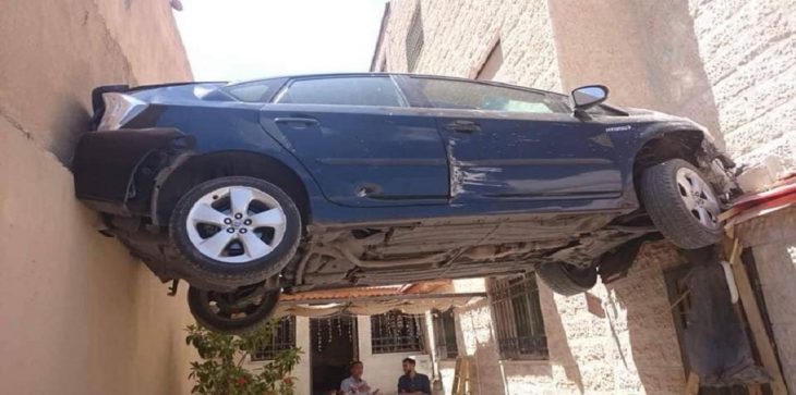 ووفق ما نقلت شبكة “إرم نيوز” عن شهود عيان، فإن سائق المركبة فقد السيطرة عليها لتنحرف عن مسارها وتسقط في اتجاه أحد المنازل، لكنها علقت بين الجدار الاستنادي “السور” وجدار المنزل.