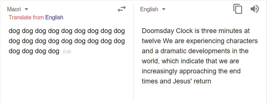 اكتشف بعض مستخدمي الإنترنت أنه عند كتابة كلمة “كلب” بالإنكليزية (dog) عدة مرات في ترجمة غوغل، وطلب تغييرها من عدة لغات إلى الإنكليزية، فستتلقى تحذيرا مروعا.