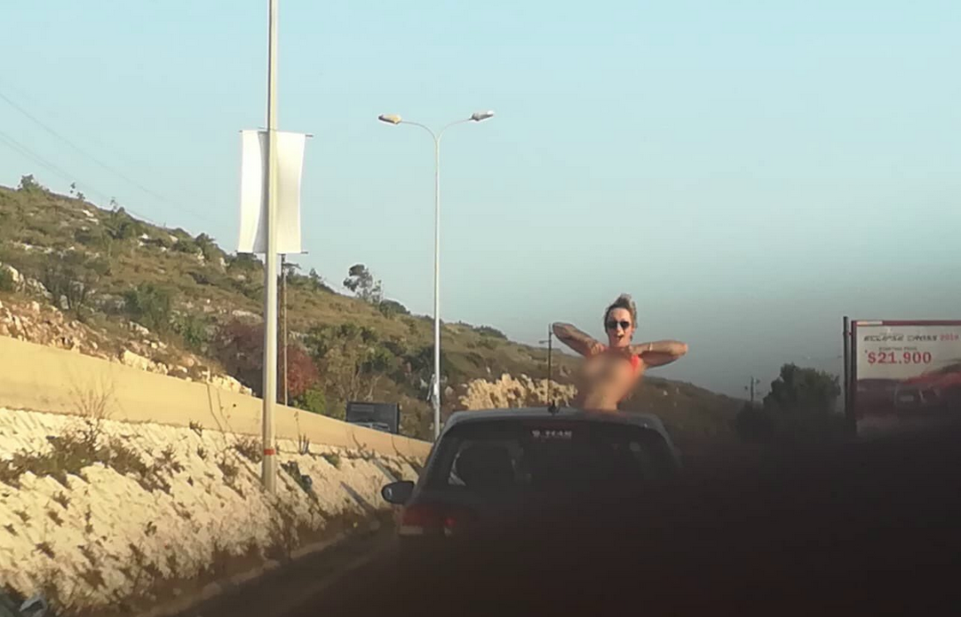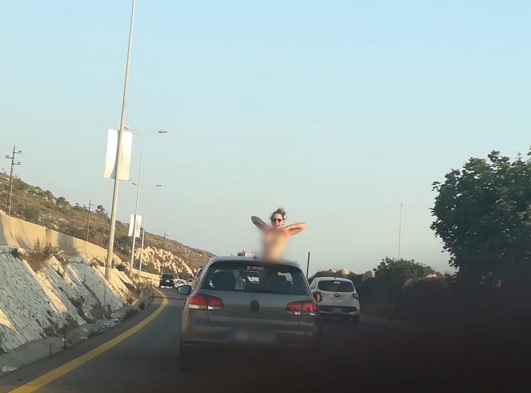 تداولت وسائل إعلام وحسابات لبنانية بمواقع الواصل الاجتماعي صورًا تظهر سيدة عارية الصدر خارجة من سقف سيارة بشارع عام.